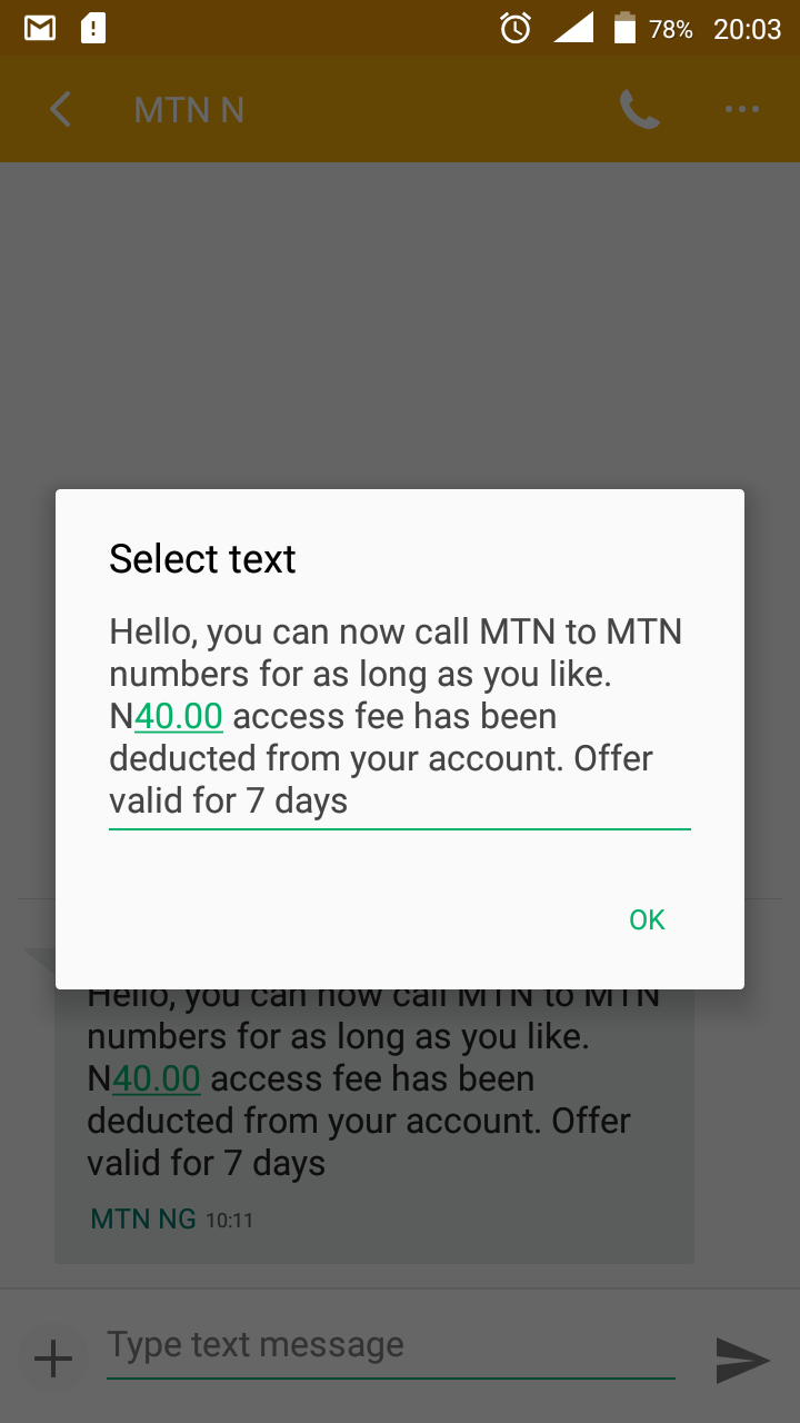 a. After you dial the ussd you could get a prompt message to press 1 to subscribe for an mtn-to-mtn calls for 7 days just for a charge of 30 or 40NGR